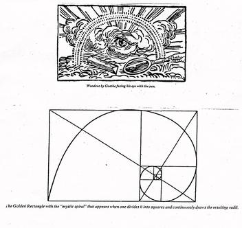 Beginning with demarcation of area into squares and *'Golden Rectangles' by staked contractor's ribbon (of 3-4 fluorescent colors); *establishing central square, adjoining squares and rectangles. *Central square also defined by 4 staked dowels through 12"dia mirrors in 36"dia circles white stone on ground; dowels topped with prisms (ideally with nearby misting water sprinklers to create 'rain-bowing' effects in daylight.